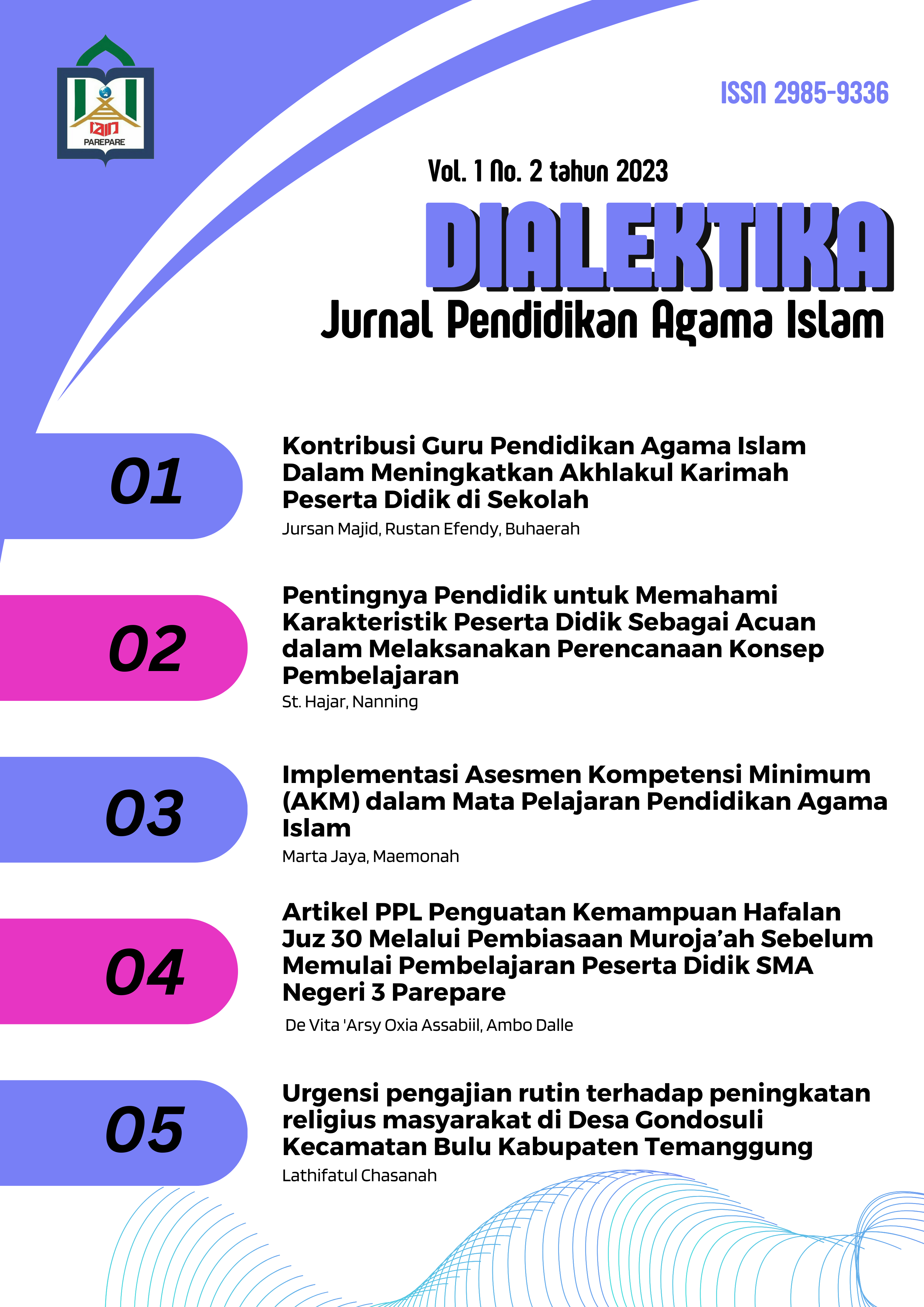 Sebagai ummat Muslim, kiranya wajib mempunyai komitmen untuk berusaha menghafal Al-Qur’an, untuk memperoleh kemulian dari Allah Subhanahuwata’ala dan untuk menjaga eksistensi kemurnian Al-Qur’an. Tentunya diperlukan metode dalam usaha menghafal Al-Qur’an, salah satunya yakni dengan menggunakan metode muroja’ah. Tujuan dari penelitian ini adalah untuk mengetahui bagaimana peran metode muroja’ah dalah penguatan hafalan juz 30 pada peserta didik di SMA Negeri 3 Parepare. Selain itu juga untuk meemberikan sumbangsi keilmuan bagi institusi maupun pembaca. Dalam penelitian ini selain menggunakan metode literature review juga menggunakan metode observasi di sekolah lokasi pelaksanaan Praktik Pengalaman Lapangan (PPL) terkait judul yang diangkat. Metode muroja’ah yang digunakan dan dibiasakan untuk diaplikasikan pada peserta didik sebelum memulai pembelajaran di SMA Negeri 3 Parepare memiliki dampak positif terhadap kualitas dan kuantitas hafalan peserta didik. Diperlukan kolaborasi oleh para guru untuk tetap menjaga kdisiplinan program hafalan juz 30 bagi peserta didik tersebut, karena selain untuk membina mental spiritual pserta didik, juga dapat membangun kecerdasan emosional religius peserta didik agar berakhlakul karimah dan memiliki jiwa berjuang dalam iman dan taqwa.