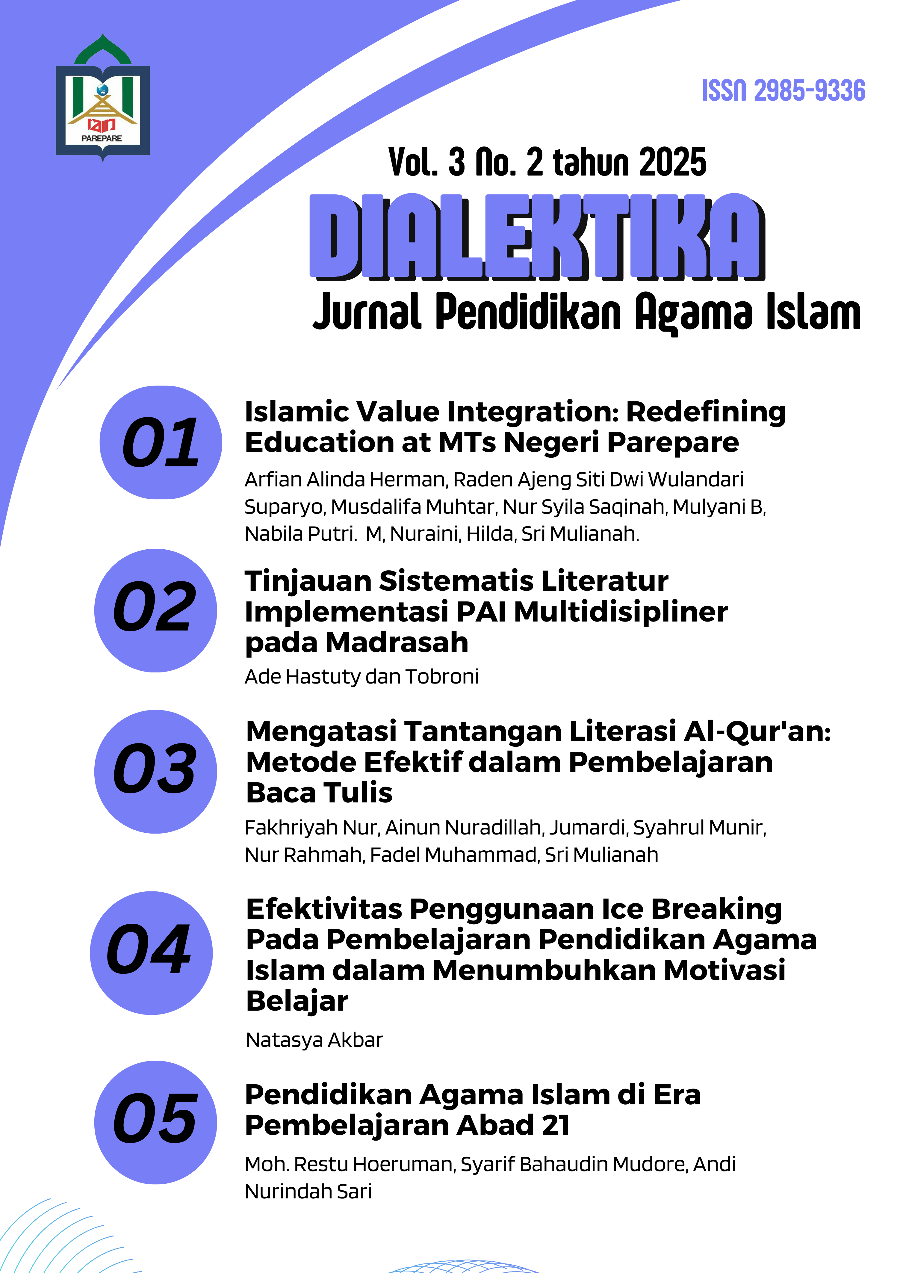 Vol. 3 No. 2 (2025)Dialektika : Jurnal Pendidikan Agama Islam adalah jurnal berkala ilmiah yang diterbitkan oleh IAIN Parepare Press dengan ISSN 2985-9336 . Pada Edisi Vol. 03 , No. 2 Tahun 2025 mengangkat isu-isu penting dan aktual tentang pendidikan agama Islam seperti pendidik ditinjau dari pendidikan Islam, peserta didik ditinjau dari pendidikan Islam, kurikulum pendidikan Islam, manajemen pendidikan Islam, metode pembelajaran ditinjau dari pendidikan Islam, media pembelajaran ditinjau dari pendidikan Islam, lembaga pendidikan Islam, sejarah pendidikan Islam, kajian tafsir tarbawi, dan kajian hadits tarbawi.