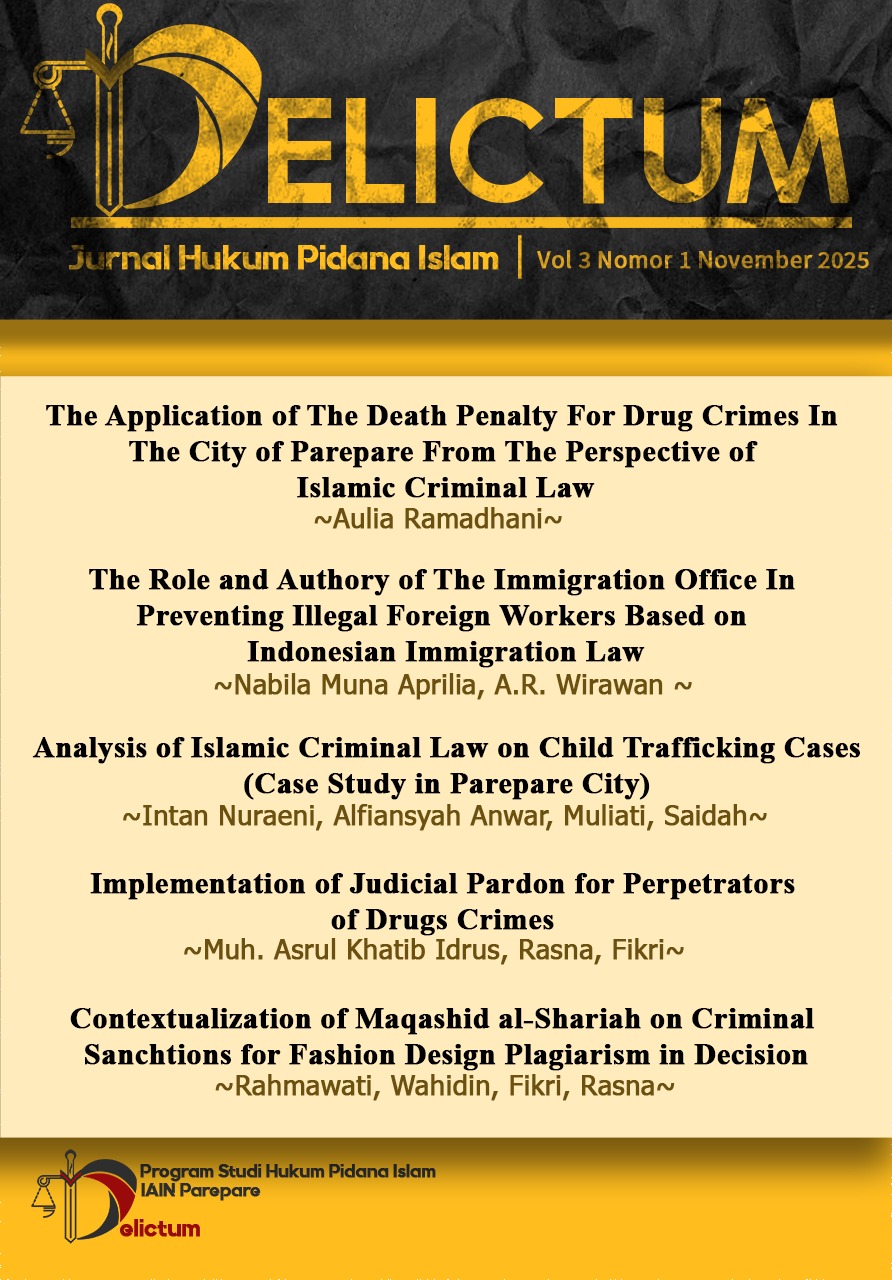 Vol. 4 No. 1 (2025)Delictum: Jurnal Hukum Pidana Islam diterbitkan oleh Prodi Hukum Pidana Islam Fakultas Syariah dan Ilmu Hukum Islam IAIN Parepare, dua kali setahun pada bulan November dan Mei. Tujuan dari jurnal ini adalah untuk memfasilitasi penelitian tentang Hukum. Artikel tersebut pada intinya memuat topik tentang Hukum Pidana Islam, Hukum Pidana, Hukum Acara Pidana, Korupsi, Perlindungan Anak dan Perempuan, Pidana Pemilu, Pidana Ekonomi, Pelanggaran dan Penegakan Hukum Hak Asasi Manusia. e-ISSN 2985-6906