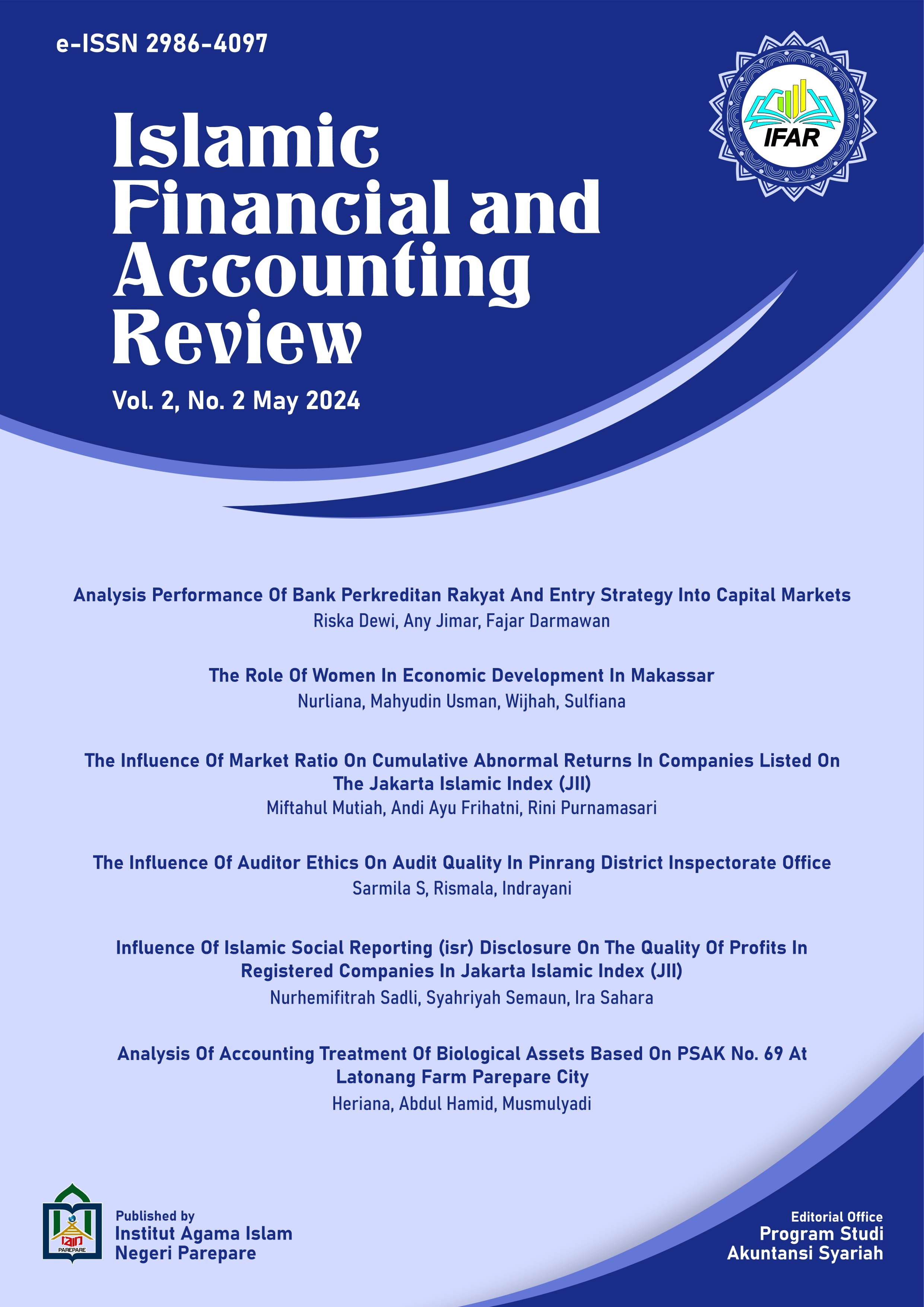 Islamic Financial And Accounting Review (iFAR) is published by SAO Jurnal IAIN Parepare and collaborated with the Department of Accounting, Faculty of Islamic Economics and Business. This journal contains are accounting research that includes Financial Accounting, Public Sector Accounting, Management Accounting, Economy, Islamic Financial Accounting and Management, Auditing, Corporate Governance, Ethics and Professionalism, Corporate Finance, Accounting Education, Taxation, Capital Market, Banking and contemporary issue about accounting.