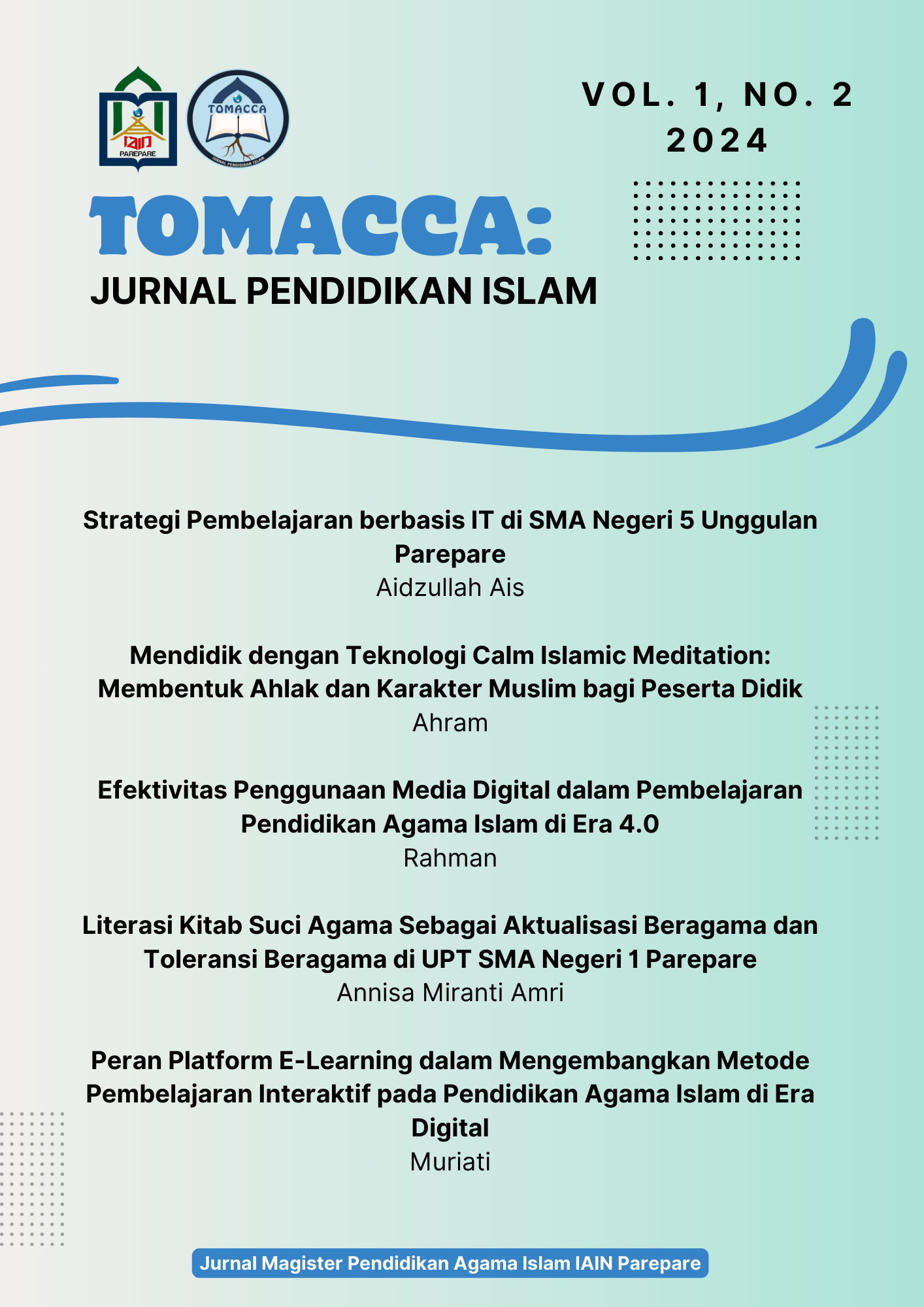 Vol. 1 No. 2 (2024)Volume 1 Nomor 2 dari Tomacca: Jurnal Pendidikan Islam menyajikan kumpulan artikel yang mengeksplorasi penerapan teknologi dan inovasi digital dalam pendidikan Islam. Edisi ini mengupas berbagai strategi pembelajaran berbasis IT di sekolah, peran teknologi dalam membentuk karakter melalui metode Calm Islamic Meditation, serta efektivitas penggunaan media digital dalam proses pembelajaran di era 4.0. Selain itu, terbitan ini juga mengulas literasi kitab suci sebagai upaya aktualisasi beragama dan toleransi, serta peran platform e-learning dalam mengembangkan metode pembelajaran interaktif. Secara keseluruhan, volume ini menawarkan wawasan komprehensif mengenai transformasi pendidikan Islam melalui integrasi teknologi dan pendekatan inovatif.