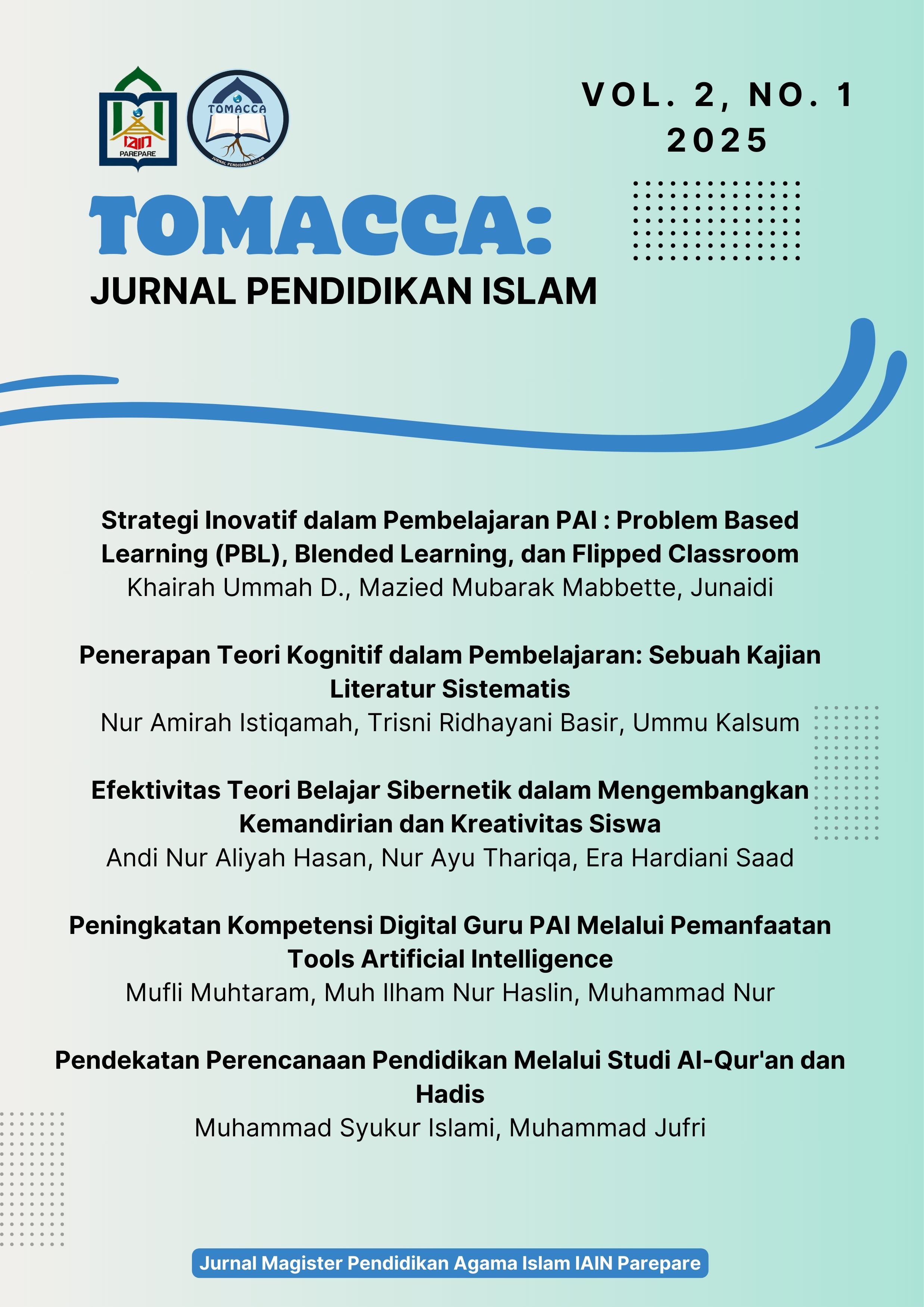 Vol. 2 No. 1 (2025)Vol. 2 No. 1 tahun 2025Tomacca: Jurnal Pendidikan Islam ini menyajikan berbagai artikel yang berfokus pada inovasi dalam pendidikan Agama Islam (PAI), dengan membahas penerapan strategi pembelajaran kreatif seperti Problem Based Learning (PBL), Blended Learning, dan Flipped Classroom, serta penerapan teori kognitif dalam meningkatkan efektivitas pembelajaran. Selain itu, jurnal ini juga mengkaji efektivitas teori belajar sibernetik untuk mengembangkan kemandirian dan kreativitas siswa, serta pentingnya peningkatan kompetensi digital guru PAI melalui pemanfaatan kecerdasan buatan. Tak ketinggalan, artikel ini juga menyajikan pendekatan perencanaan pendidikan yang berbasis pada studi Al-Qur'an dan Hadis, sebagai upaya merancang kurikulum yang relevan dengan prinsip-prinsip Islam dan tuntutan zaman.